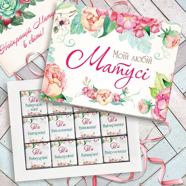 Ви думаєте, що можна піднести Мамі в подарунок? Цей шоколадний набір буде кращою ідеєю для подарунка! Тут на кожній плитці шоколаду написані приголомшливі компліменти на мелодійному українською мовою, висловлюючи Вашу любов до Мамі. Вона буде дуже рада, якщо отримає такий наборчик, адже крім красивих написів і цікавого дизайну, тут ще є смачний шоколад, від якого без розуму будь-яка жінка. Подарунок можна купити Мамі на День Народження, на 8 березня або ж просто так - в будь-якому випадку він принесе масу позитивних емоцій!